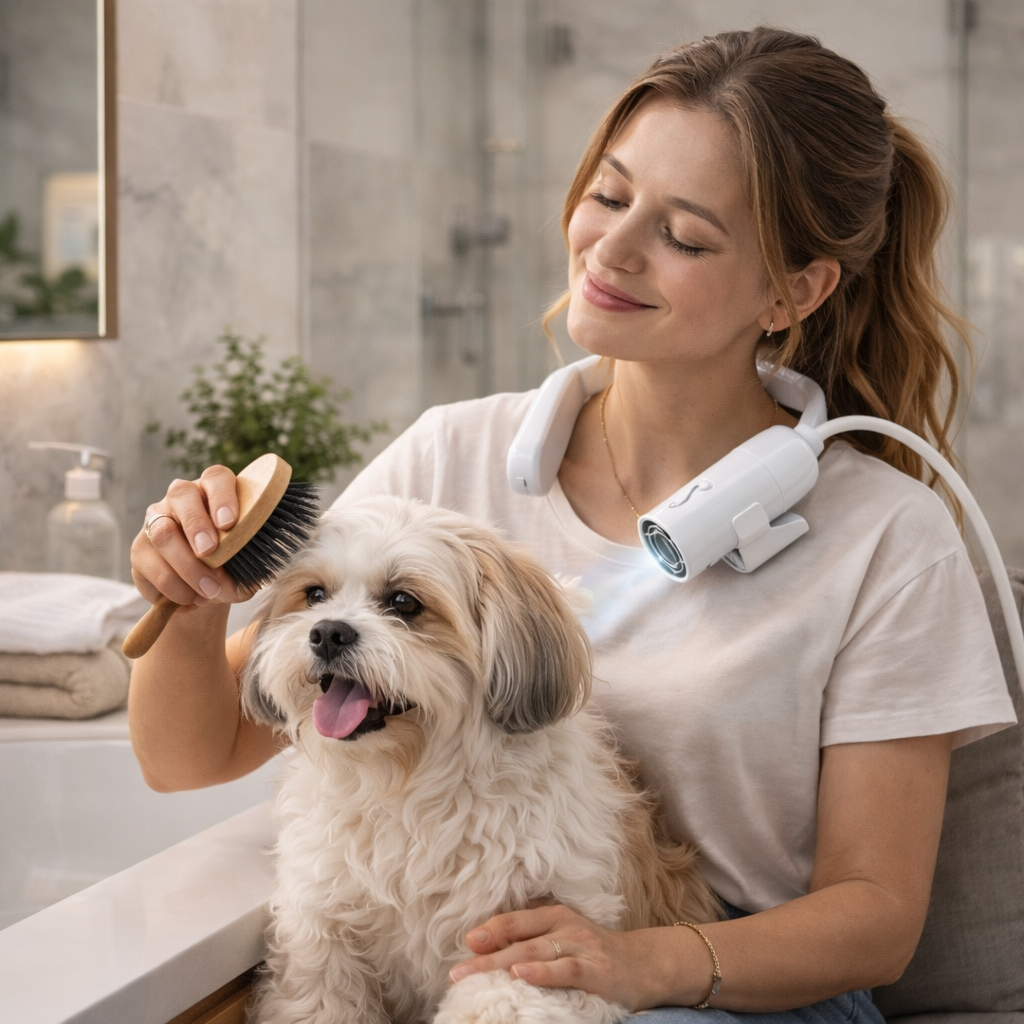Avec notre séchoir mains libres, pour brosser rassurer et prendre soin de votre chien en toute simplicité.